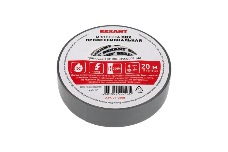 Изолента 0,18х19мм, 20м, серая, REXANT 09-2808