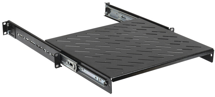 Полки для шкафов и стоек ITK предназначены для размещения на них внутри шкафа оборудования, приборов и аппаратуры, не имеющих кронштейнов и уголков крепления на 19" профили напрямую. К такому оборудованию относятся аккумуляторные батареи, не стоечные ИБП, KVM-консоли, измерительные приборы, медицинское оборудование и прочее. Выдвижные полки крепятся на фронтальные и на задние профили, имеют перфорированную поверхность для обеспечения лучшего охлаждения и отведения теплых воздушных потоков, а за счёт наличия специальных телескопических салазок способны плавно выдвигаться вперед за пределы рабочей плоскости, образованной передней парой 19'' профилей. Данные полки рассчитаны на оборудование, требующее регулярного обслуживания и извлечения из шкафа, но с небольшой общей массой, чтобы избежать его опрокидывание и возможной поломки выдвижного механизма полки.