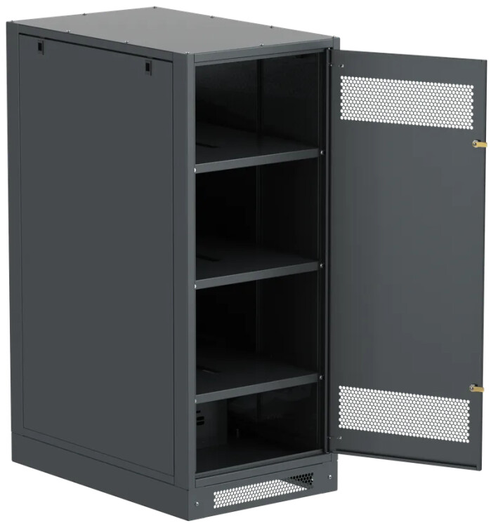 Шкаф аккумуляторный серии LINEA B предназначен для размещения и защиты от несанкционированного доступа аккумуляторных батарей (АБ). Шкафы LINEA B повышенной прочности со сварным каркасом и усиленными полками позволяют размещать АБ до 500 кг. на полке. Вместе со шкафом поставляются полки. Количество полок в комплекте зависит от высоты шкафа. Каркас позволяет размещать полки с шагом 30мм. В полках предусмотрены вырезы для удобства соединения АБ. В нижней части корпуса предусмотрена плата для установки предохранителя-выключателя-разъединителя ПВР. Шкаф аккумуляторный серии LINEA B односекционный поставляется на цоколе высотой 100мм. Все металлические части шкафа LINEA B заземлены.В комплект включены РЫМ-болты для удобства перемещения шкафа. Вентиляционные отверстия в дверях и задней панели обеспечивают циркуляцию воздуха.