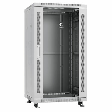 Шкафы CABEUS оптимальное решение для установки кроссового, телекоммуникационного серверного оборудования, стандарта 19 дюймов (19"). Имея современный дизайн, шкафы предназначены для установки и использования внутри помещений. В основе шкафа лежит конструкция из двух сварных рам, что позволяет без труда выдерживать нагрузку до 800 кг. В основание шкафа и в крыше предусмотрены щеточные вводы для защиты оборудования от пыли при вводе информационного и силового кабеля. В шкафу великолепно продумана естественная (пассивная) вентиляция, за счет перфорации в корпусе шкафа и на передней дверце. А так же, конструктивно, предусмотрена установка активной вентиляции. Четыре 19" монтажных L - профиля, имеют юнитовую (U) разметку в соответствии со стандартом DIN 41494-7, глубина установки направляющих может изменяться в зависимости от устанавливаемого оборудования. Две съемные боковые панели – обеспечивают удобный доступ к установленному оборудованию. Фиксация боковых панелей, осуществляется при помощи защелок.