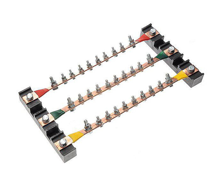 Блок фазных медных шин 3х20 мм по 10 присоединений, габариты - 350 х 160 х 45 мм, 275А, 380В (CBG-БФШ-3.20-10). Предназначена для установки в низковольтных комплектных устройствах (НКУ). Служит для присоединения нулевых защитных (PE) проводников. Материал шины: медь.