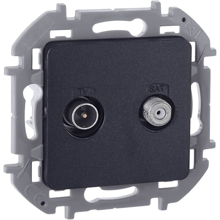 Розетка TV-SAT двухкабельная для скрытого монтажа Inspiria, для схемы "звезда", затухание 1,5дБ, 4-2400МГц / 1,5дБ 4-2400МГц, поддержка обратного питания для активных антенн до 500мА, цвет "Антрацит". Используется для подключения ТВ приемника к системе эфирного вещания, а также для подключения ресивера к спутниковой антенне.
