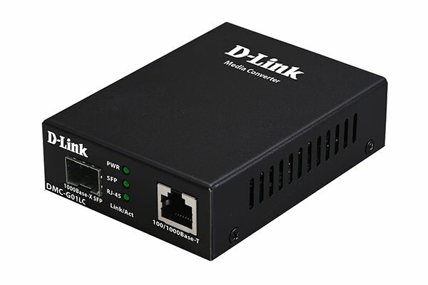 Медиаконвертер DMC-G01LC преобразует сигнал стандарта 100/1000Base-T по витой паре в сигнал стандарта 1000Base-X по оптическому кабелю.