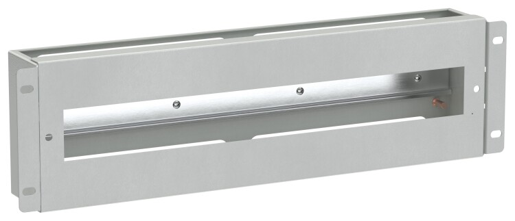 Панель электрораспределительная предназначена для размещения модульного электротехнического оборудования в 19” шкафах и имеет вырез 19" высотой 3U с установленной внутри DIN-рейкой.