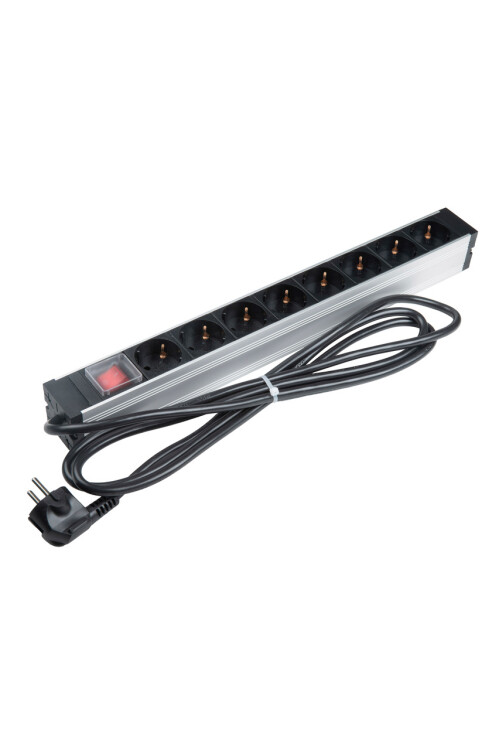 Блок розеток для 19" шкафов, горизонтальный, 8 розеток Schuko, выключатель с подсветкой, кабель питания 2.5м (3х1.5мм2) с вилкой Schuko 16A, 250В, 482.6x44.4x44.4мм (ШхГхВ), корпус алюминий