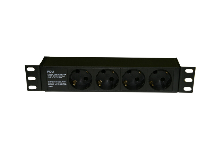 Hyperline SHE10-4SH-IEC Блок розеток для 10" шкафов, горизонтальный, 4 розетки Schuko, без кабеля питания, входной разъем IEC320 C14 10A, 250В, 270х44.4х44.4мм (ДхШхВ), корпус алюминий, черный