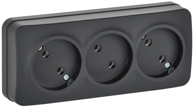 GLORY Розетка 3-местная для открытой установки без заземления без защитных шторок 10А РС23-2-ХЧм чер