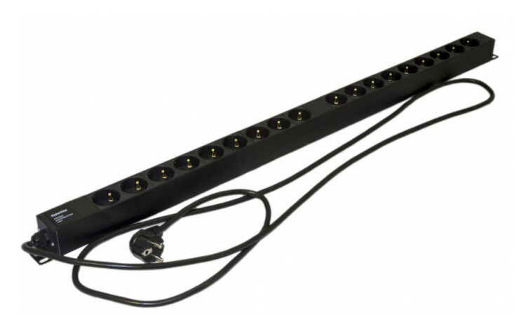 Hyperline SHE-18SH-2.5EU Блок розеток, вертикальный, 18 розеток Schuko, кабель питания 2.5м (3х1.5мм2) с вилкой Schuko 16A, 250В, 950x44.4x44.4мм (ДхШхВ), корпус алюминий, черный