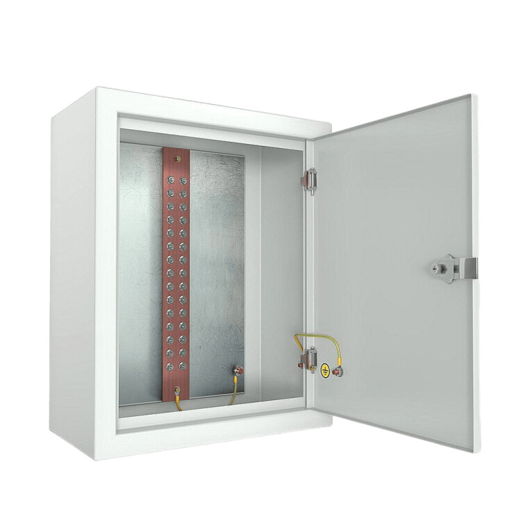 Ящик ГЗШ 30 подключений, 6х80 мм (ВхШхГ-500х400х220 мм), 1480 А, IP31, цвет серый Ral 7035 (CBG-ЯГЗШ-30-6.80). Стальной электрический щит IP31 с оцинкованной монтажной панелью, на которую вертикально установлена ГЗШ-30. Корпус ящика выполнен из холоднокатанного тонколистового стального листа толщиной 1 мм., покрытый полимерно-порошковой краской серого цвета RAL 7035. Конструкция ящика цельносварная, задняя стенка имеет четыре отверстия d=8 мм, передняя дверь оснащена точечным замком. В нижней части шкафа имеются три круглых отверстия d=32 мм для заведения кабеля заземления. Медная шина расположена вертикально, и установлена на оцинкованную монтажную панель через изоляторы SM-35.