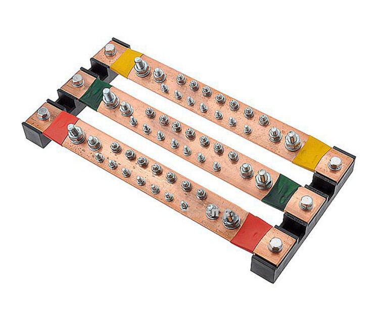 Блок фазных медных шин 6х30 мм 3x18 (М5 - 7 шт., М6 - 7 шт., М8 - 2 шт., М10 - 2 шт.) присоединений, габариты - 515 х 160 х 45 мм, 630А, 380В (CBG-БФШ-6.30-18). Предназначен для установки в низковольтных комплектных устройствах (НКУ). Служит для распределения переменного трёхфазного тока. Материал шины: медь. Тип изолятора: ШД30-630 фенопластовый.