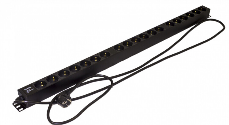 Hyperline SHE-19SH-2.5EU Блок розеток, вертикальный, 19 розеток Schuko, кабель питания 2.5м (3х1.5мм2) с вилкой Schuko 16A, 250В, 780x44.4x44.4мм (ДхШхВ), корпус алюминий, черный