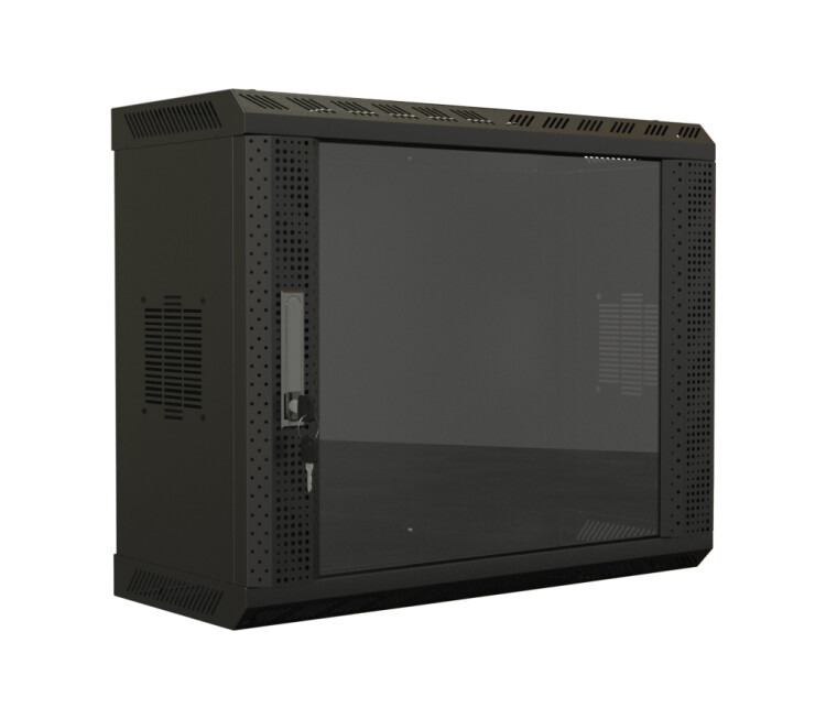 Hyperline TWS-1225-GP-RAL9004 Шкаф настенный 19-дюймовый (19"), 12U, 650х600х250, со стеклянной дверью, несъемные боковые панели, цвет черный (RAL 9004) (собранный) Шкафы телекоммуникационные серии TWS предназначены для эксплуатации в стационарных условиях внутри помещений; используются для настенного монтажа. Шкафы TWS имеют съемную заднюю панель; боковые стенки не снимаются. Шкаф поставляется в собранном виде, но имеет при этом разборную конструкцию. Габаритная глубина составляет 250 мм. Телекоммуникационное, серверное, кроссовое и другое оборудование стандарта 19 дюймов (19") размещается внутри шкафа на двух вертикальных направляющих (19-дюймовых монтажных профилях), устанавливаемых спереди шкафа. · Ввод кабелей через нижнюю и верхнюю панели · Кабельные вводы закрыты выламываемыми заглушками · В боковых стенках имеется штатное место под вентилятор · Боковые стенки несъемные, снимается только задняя панель · Возможна левосторонняя и правосторонняя навеска двери