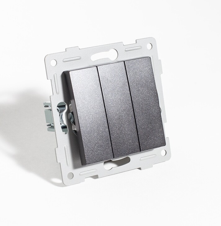 Выключатель трехклавишный, 10А, 220-250V (антрацит) используется для управления несколькими контурами освещения из одной точки. Применяется для скрытого монтажа в стены в подрозетник или накладную монтажную коробку глубиной не менее 40мм.