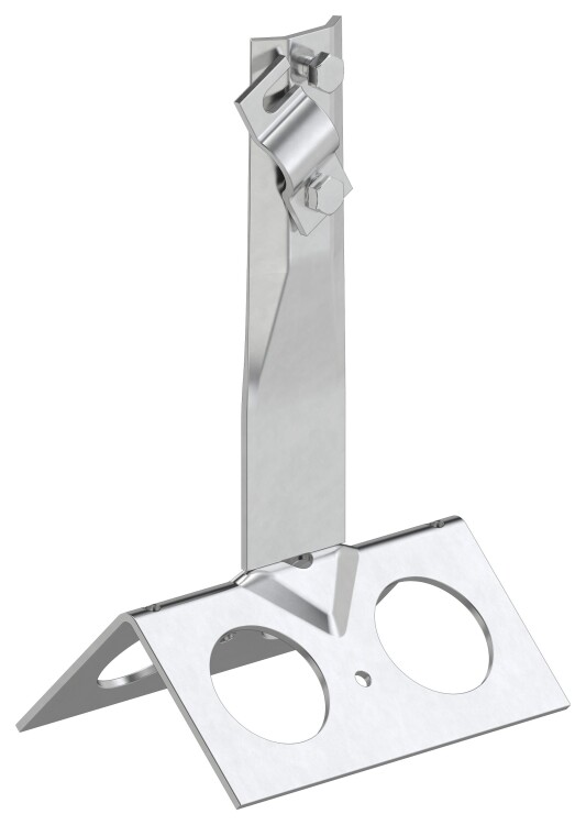 Держатель проводника круглого для конька с болтовым зажимом широкий предназначен для закрепления прутка на коньке скатной кровли. Держатель крепится к кровле при помощи метизов. Зажим проводника происходит при помощи болтового соединения. Материал корпуса - нержавеющая сталь.