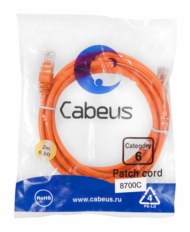 Патч-корд 4 пары, 2хRJ45, 2м, Кат.6, UTP, оранжевый, PVC, Cabeus PC-UTP-RJ45-Cat.6-2m-OR
