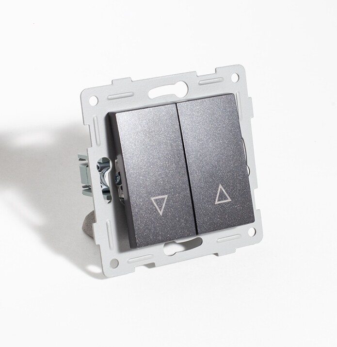 Выключатель управления жалюзи, 10А, 220-250V (антрацит) используется для управления для жалюзи и рольставней. Применяется для скрытого монтажа в стены в подрозетник или накладную монтажную коробку глубиной не менее 40мм.