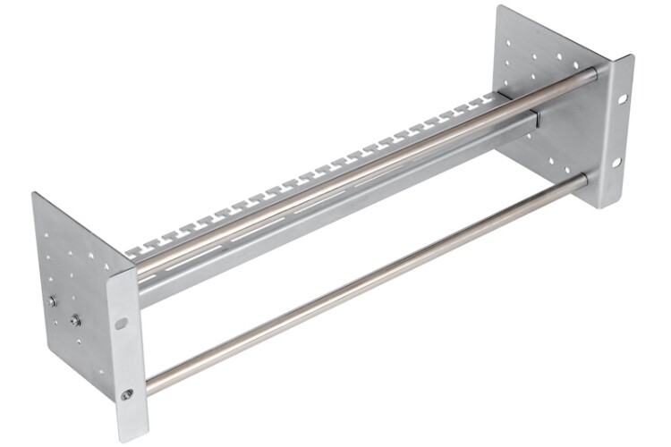 Рама-штанга, с круглыми направляющими, предназначена для установки 10-ти парных плинтов типа KRONE LSA Profil. Используется для установки в шкафы и стойки стандарта 19”. Высота конструктива составляет 3U. Количество плинтов, которые можно установить на такой конструктив, составляет 19 шт. Корпус выполнен из металла, имеется проводник заземления конструктива. Глубина установки плинтов может регулироваться в трех положениях. Имеется задний кабельный организатор.