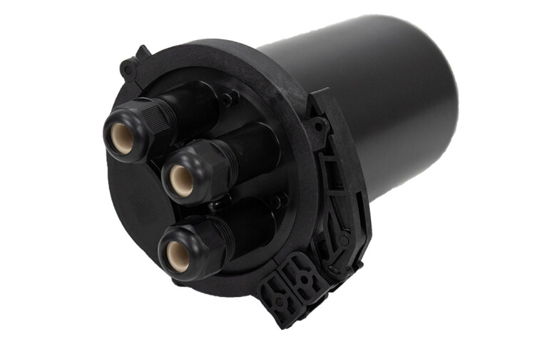 Тупиковая муфта МТОК-Р7 предназначена для монтажа подвесных самонесущих ОК, оптических кабелей с вынесенным силовым элементом типа «8», а также городских кабелей любых конструкций. В муфте предусмотрен овальный ввод для транзитной петли оптических модулей без разрезания. Выкладка петли модулей осуществляется на лотке с противоположной стороны от кассет. Способ герметизации корпуса с оголовником механический. Осуществляется при помощи эластичной кольцевой прокладки и армированного пластикового хомута с самозатягивающимся замком. Замок хомута сконструирован таким образом, что при открывании защелка трансформируется в рычаг, обеспечивающий легкое снятие хомута с муфты. Ввод кабеля, крепление и герметизация осуществляется с помощью резьбовых фитингов, отлитых непосредственно на оголовнике муфты. Муфта имеет три круглых патрубка с фитингами и один овальный, герметизация вводимых в который кабелей осуществляется также механическим способом.