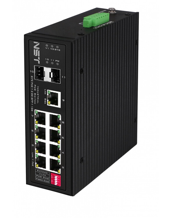 Промышленный PoE коммутатор Fast Ethernet на 8 FE RJ45 PoE + 1 x GE RJ45 + 2 GE SFP порта. Порты: 8x10/100Base-T, 1x10/100/1000Base-T, 2x1000Base-X. Порты PoE: 1-2 - до 90W (IEEE 802.3af/at/bt),3-8 - до 30W (IEEE 802.3af/at). Автоматическое определение PoE устройств. Суммарная мощность PoE до 360W. Поддержка режима CCTV: Увеличение расстояния передачи данных и питания до 250 м. Встроенная грозозащита 6kV на порт, электростатическая защита 8кВ. Питание: 2 x входа DC37-57V(370W).БП в комплект НЕ входит. Монтаж на DIN-рейку или на стену (крепление в комплекте). Размеры (ШхВхГ): 50х187х130мм. Вес: 1,3кг. Рабочая температура: -40…+80°С