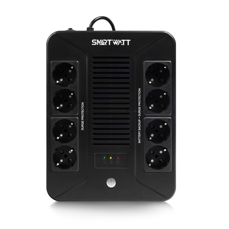 SMARTWATT UPS SAFE PRO 1000 — универсальный источник бесперебойного питания, предназначенный для защиты офисного, торгового (кассовые аппараты и т.п.) и бытового оборудования. ИБП оснащено 8 розетками (4 с поддержкой и защитой подключенного оборудования и 4 с дополнительным резервным питанием), имеет интуитивно понятную LED индикация для обеспечения безопасной работы компьютерной и другой техники. При необходимости ИБП можно разместить на стене для экономии пространства и удобства пользователя.