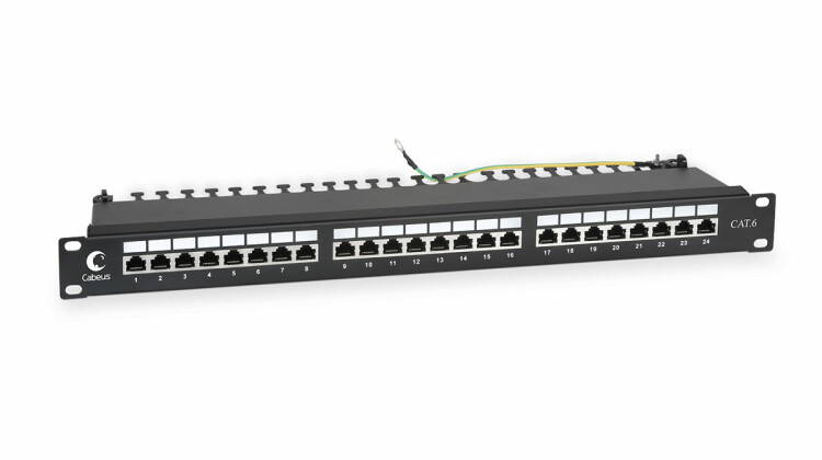 Коммутационные панели (патч-панели) предназначены для терминирования на них кабелей различных подсистем СКС и для коммутации отдельных элементов сети друг с другом при помощи коммутационных шнуров. Экранированная патч-панель Cabeus выполнена в 19” формате и предназначена для установки в телекоммуникационные шкафы и стойки. Соответствует характеристикам категории 6. С лицевой стороны все порты пронумерованы и имеют дополнительные поля для нанесения маркировки. Корпус полностью металлический с разборной крышкой быстрой фиксации. Имеется проводник заземления. С тыльной стороны патч-панели размещены контакты типа Dual IDC с цветной маркировкой по двум стандартам: T568 А и B. Ножи контактов располагаются под 45°, что лучше сказывается на передаточных характеристиках разъема. Для заделки проводников подходят ножи тип 110 и Krone. Патч-панель имеет встроенный задний организатор для фиксации кабелей и дополнительный фиксатор экрана кабеля.