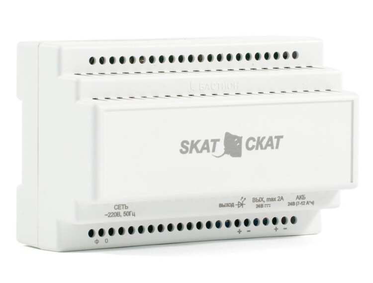 24 В, 2 А. Пластиковый корпус под DIN-рейку 35 мм. Внешний АКБ от 7 Ач (2 шт). Источник бесперебойного питания SKAT-24-2.0-DIN (СКАТ ИБП-24/2-DIN) предназначен для электропитания радиоэлектронной аппаратуры номинальным напряжением 24 В. Область применения: питание систем охранно-пожарной сигнализации, контроля и управления доступом, видеонаблюдения, устройств автоматики, домофонов, телекоммуникационного оборудования и др.