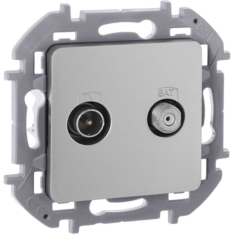 Розетка TV-SAT двухкабельная для скрытого монтажа Inspiria, для схемы "звезда", затухание 1,5дБ, 4-2400МГц / 1,5дБ 4-2400МГц, поддержка обратного питания для активных антенн до 500мА, цвет "Алюминий". Используется для подключения ТВ приемника к системе эфирного вещания, а также для подключения ресивера к спутниковой антенне.