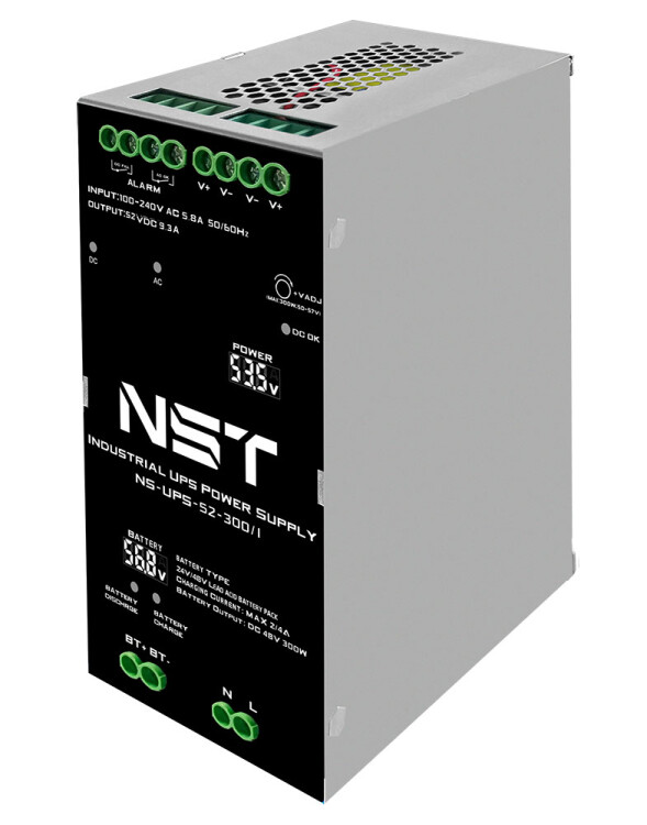 Промышленный блок питания с функцией ИБП на 300W. Входное напряжение: AC100-265V. Выходное напряжение: DC 52V. Регулировка выходного напряжения: DC50-57V. Максимальная выходная мощность в режиме заряда батарей - 300W. Выходное напряжение в режиме ИБП: 48V. Поддерживаемые батареи: Свинцово-кислотные батарейные сборки 48V. Максимальная емкость - 100Ah. Автоматическое управление зарядом батарей. Максимальный ток заряда - 4A. Защита от перегрузки, перенапряжения, короткого замыкания, перегрева. Тревожный выход состояния батареи и входного напряжения. Отображение напряжения, тока, мощности в реальном времени. Монтаж на DIN-рейку. Размеры (ШхВхГ): 73x152x114мм Рабочая температура: -40...+80°C.