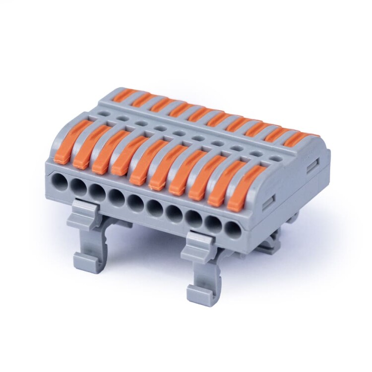 Универсальная проходная изолированная клемма с возможностью монтажа на DIN-рейку предназначена для многоразового подключения любых типов медных проводников: одножильных и многожильных. Зажим проводов в клемме осуществляется при помощи рычагов. Специальное технологическое отверстие на корпусе клеммы предназначено для проверки соединения тестером-пробником или щупом мультиметра. Элемент фиксации к DIN-рейке съемный. Клеммы обеспечивают простой и быстрый монтаж. Основные характеристики: Количество зажимов - 20, Количество линий (полюсов) - 10, Проводник - одножильный/многожильный, Материал проводника - медь, Сечение проводника - до 4,0 мм², Номинальный ток - 32 А, Максимальное напряжение - 400 В, Материал контактов - луженая медь, Материал корпуса - полиамид, Температура эксплуатации - -30°C...85°C.