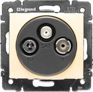Розетка TV-FM-SAT тип звезда VALENA. Предназначена для организации индивидуального подключения телевизионных, FM-радио и спутниковых (SAT) сигналов по схеме "звезда". Каждая розетка подключается напрямую к сплиттеру или мультисвитчеру, обеспечивая независимый высококачественный сигнал без потерь.