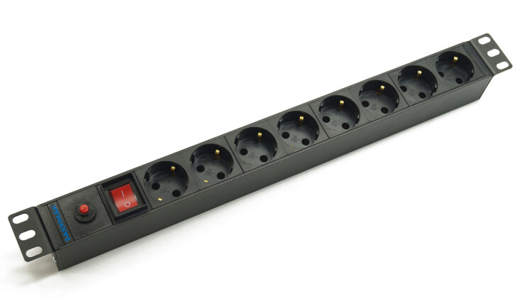 Блок розеток 19", 1U, 8 гнёзд (Schuko), вход C14, 10А, 250В, с LED выключателем, черный, без кабеля, DANNMAN 7000920