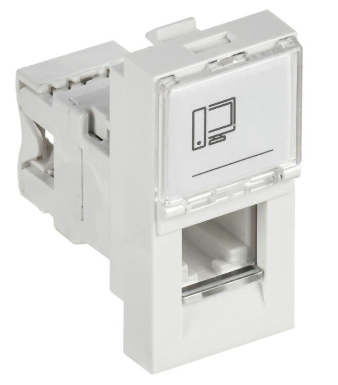 Модульные электроустановочные изделия 45х45 серии ПРАЙМЕР предназначены для организации рабочего места с применением кабель-каналов, напольных лючков или розеточных блоков, а также для открытого монтажа в коробки типа КМКУ. Розетка компьютерная RJ-45 предназначена для подключения сетевого кабеля компьютерной и прочей оргтехники. Розетка на 1 вход. Комплектуются одним модулем Keystone Jack категории 5е UTP IDC. Размеры, ВхШхГ,мм: 45х22,5х41,7. Цвет - белый. Размеры модульных ЭУИ ПРАЙМЕР: 1 модуль = 45х22,5 мм 2 модуля (1 пост) = 45х45 мм