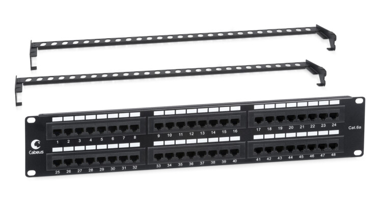 Коммутационные панели (патч-панели) предназначены для терминирования на них кабелей различных подсистем СКС и для коммутации отдельных элементов сети друг с другом при помощи коммутационных шнуров. Неэкранированная патч-панель Cabeus выполнена в 19” формате и предназначена для установки в телекоммуникационные шкафы и стойки. Соответствует характеристикам категории 6а. Имеет 48 портов RJ-45 на 2U. С лицевой стороны все порты пронумерованы. С тыльной стороны патч-панели размещены контакты типа Dual IDC с цветной маркировкой по двум стандартам: T568 А и B. Ножи контактов располагаются под 90°. Для заделки проводников подходят ножи тип 110 и Krone. В комплект патч-панели входят 2 съемных задних организатора для фиксации кабелей.