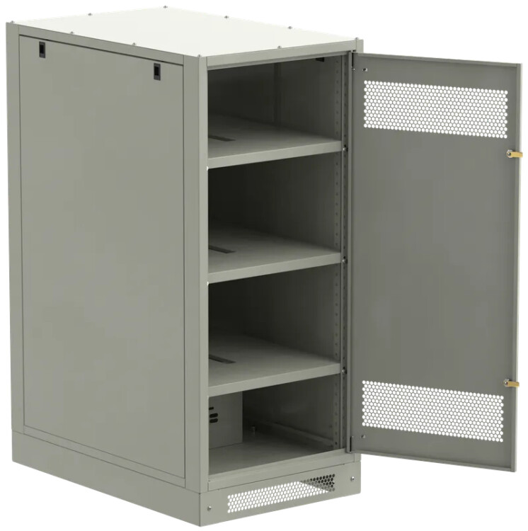 Шкаф аккумуляторный серии LINEA B предназначен для размещения и защиты от несанкционированного доступа аккумуляторных батарей (АБ). Шкафы LINEA B повышенной прочности со сварным каркасом и усиленными полками позволяют размещать АБ до 500 кг. на полке. Вместе со шкафом поставляются полки. Количество полок в комплекте зависит от высоты шкафа. Каркас позволяет размещать полки с шагом 30мм. В полках предусмотрены вырезы для удобства соединения АБ. В нижней части корпуса предусмотрена плата для установки предохранителя-выключателя-разъединителя ПВР. Шкаф аккумуляторный серии LINEA B односекционный поставляется на цоколе высотой 100мм. Все металлические части шкафа LINEA B заземлены. В комплект включены РЫМ-болты для удобства перемещения шкафа. Вентиляционные отверстия в дверях и задней панели обеспечивают циркуляцию воздуха.