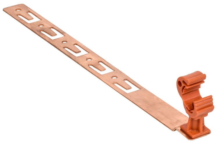 Держатель проводника круглого для черепичной кровли с крючками и пластиковым фиксатором предназначен для закрепления прутка на черепичной, мягкой и шиферной кровле. Держатель крепится к кровле при помощи зацепных крючков. Фиксация проводника происходит при помощи защелкивания пластикового зажима. Материал корпуса - медь