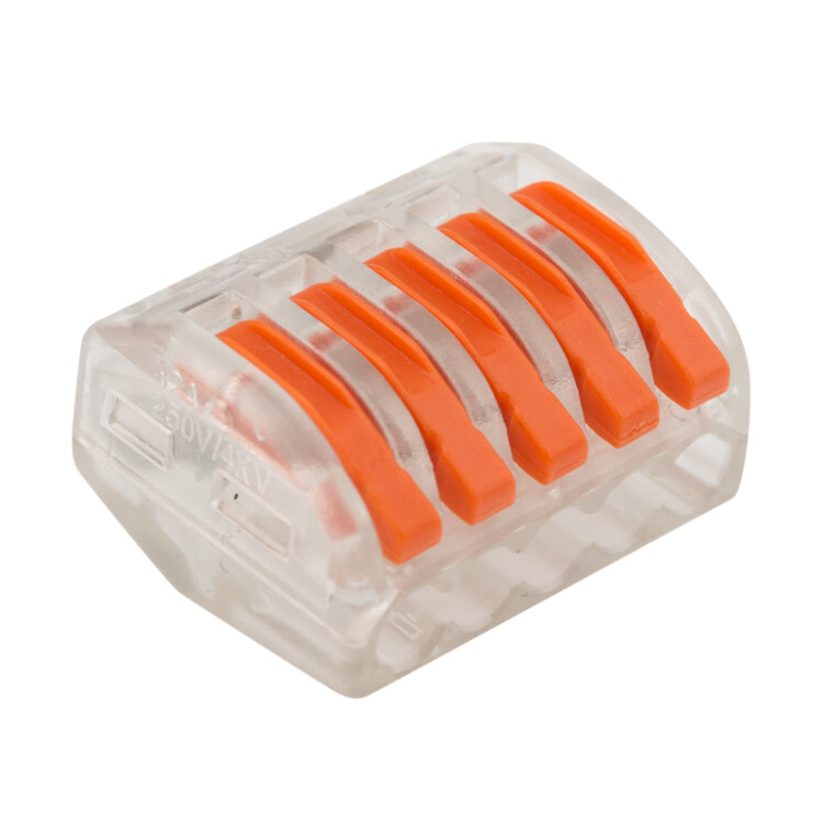 Соединительная многоразовая клемма REXANT на 5 проводников с плоско-пружинным зажимом предназначена для подсоединения медных одножильных и многожильных зачищенных проводников тонкого сечения. Перед монтажом с соединяемых проводников необходимо снять изоляцию в соответствии с обозначениями на корпусе клеммы (9-12 мм). Зачищенный участок с монтажной стороны не должен иметь сильных изгибов. Вставьте его в свободное гнездо клеммы, предварительно подняв оранжевый рычажок, после этого опустите рычажок в исходное положение. Контакт осуществляется путем зажима проводника пластиной. Конструкция предотвращает случайное размыкание контакта. Специальное технологическое отверстие на корпусе клеммы предназначено для проверки соединения тестером-пробником или щупом мультиметра. Корпус из пластика делает контакт изолированным. Извлечение проводника (демонтаж) осуществляется действиями в обратном порядке.