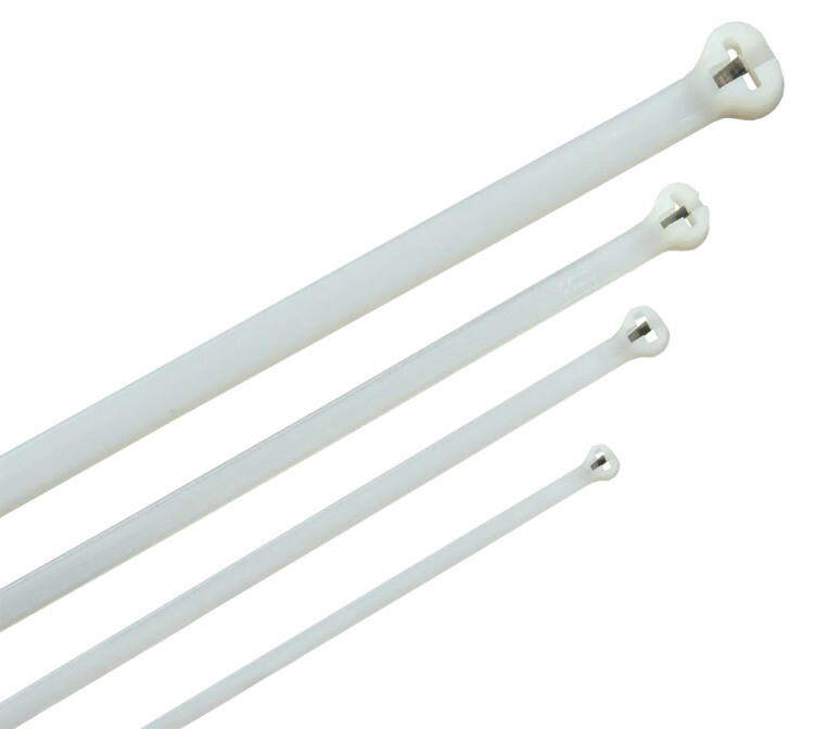 Модернизированный хомут-стяжка с усиленной замковой частью предназначен для бандажирования в пучок крепления проводов или кабелей при проведении электромонтажных и строительных работ.