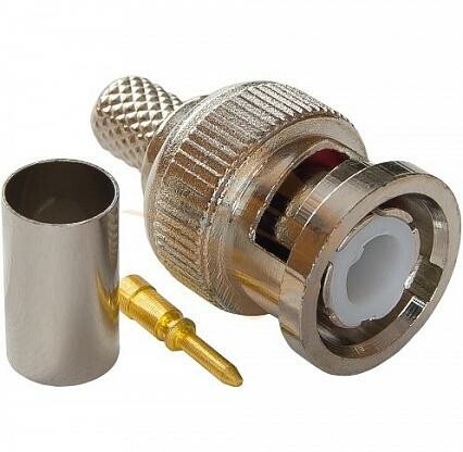 РАЗЪЁМ штекер BNC RG-59 обжим REXANT предназначен для подключения коаксиального кабеля c волновым сопротивлением 50 или 75 Ом к видеокамерам, видеорегистраторам, мониторам и другим радиоэлектронным устройствам. BNC-коннектор (BNC сокр. от Bayonet Neill Concelman) обжимной - электрический разъем с байонетной фиксацией закрепляется на кабеле обжимом с помощью специализированных клещей для коаксиальных кабелей. Такое соединение обеспечит безопасную, качественную и долговечную эксплуатацию видеоаппаратуры. BNC-разъем изготовлен из материалов: корпус - никелированный цинк; центральный контакт - латунь с напылением технического золота; диэлектрик - фторопласт; обжимная втулка - никелированная латунь. Диапазон рабочих температур от -40℃ до +110℃. Использование сплава меди (биметалл) и никелевого покрытия повышает долговечность разъема и позволяет применять в условиях климатических перепадов.