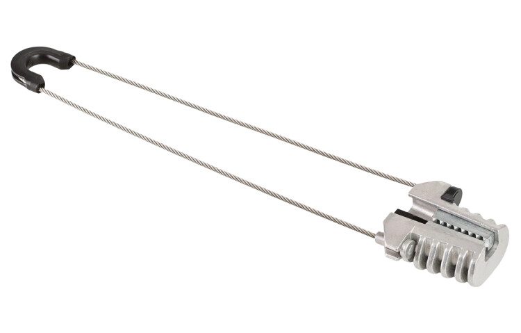Предназначен для натяжного крепления оптического кабеля с выносным силовым элементом. Применяется для кабеля с силовым элементом, выполненным из стального троса. Зажим состоит из открытого конического корпуса усиленного ребрами жесткости, пары зубчатых клиньев (зажимное устройство) и гибкой петли. Устанавливается парами в начале, конце и в интервале 3- 5-ти опор по протяженности кабельной линии.