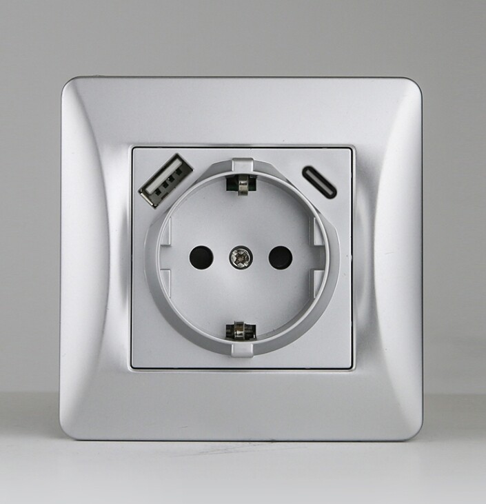 Розетка электрическая 2К+З/2xUSB A/C, 125-250V (серебристый) предназначена для подключения к электросети различных бытовых электроприборов. Применяется для скрытого монтажа в стены в подрозетник или накладную монтажную коробку глубиной не менее 40мм. В комплект входит суппорт для монтажа на захватах (распорных лапках) или винтах, выполненный из прочного сплава и лицевая накладка из качественного ABS-пластика, устойчивого к царапинам и УФ-излучению.