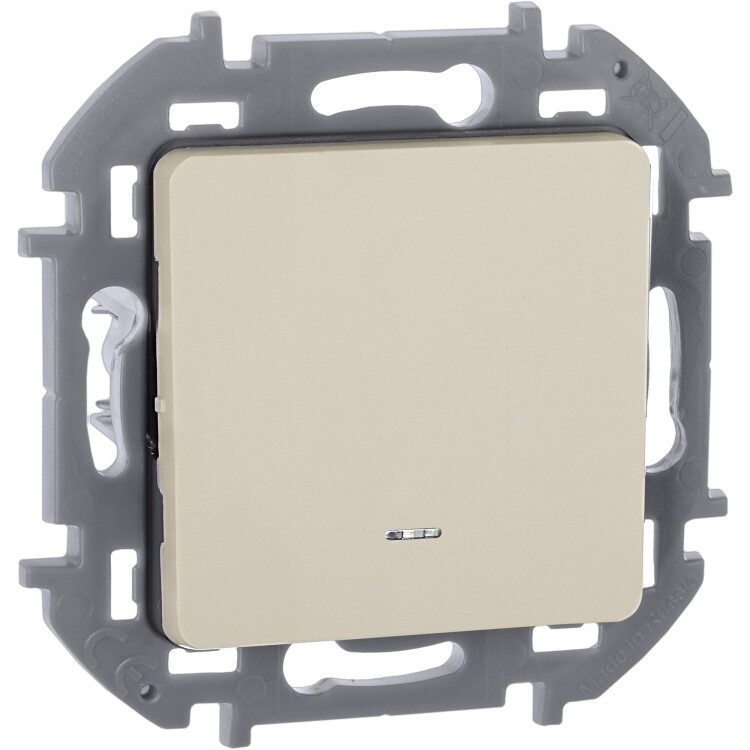 Переключатель одноклавишный с подсветкой/индикацией скрытого монтажа Inspiria, цвет "Слоновая кость", номинальный ток 10АХ, напряжение ~250В, безвинтовые зажимы. Устанавливается в жилых и общественных помещениях для управления приборами освещения, вентиляции и т.д. Предназначен для управления одной нагрузкой с одного, двух или более мест (совместно с перекрёстными переключателями).
