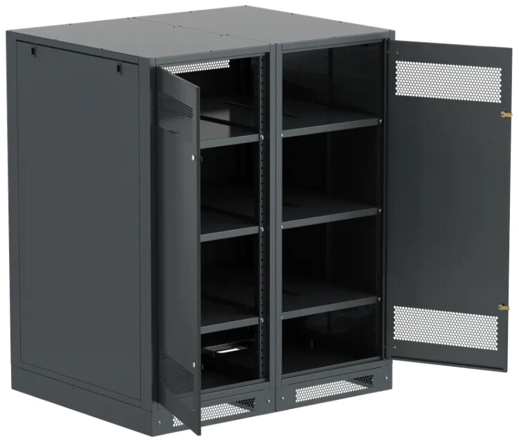 Шкаф аккумуляторный серии LINEA B предназначен для размещения и защиты от несанкционированного доступа аккумуляторных батарей (АБ). Шкафы LINEA B повышенной прочности со сварным каркасом и усиленными полками позволяют размещать АБ до 500 кг. на полке. Вместе со шкафом поставляются полки. Количество полок в комплекте зависит от высоты шкафа. Каркас позволяет размещать полки с шагом 30мм. В полках предусмотрены вырезы для удобства соединения АБ. В нижней части корпуса предусмотрена плата для установки предохранителя-выключателя-разъединителя ПВР. Шкаф аккумуляторный серии LINEA B двухсекционный поставляется на цоколе высотой 100мм. и состоит их двух секций. В месте эксплуатации требуется соединение секций метизами из комплекта поставки. Все металлические части шкафа LINEA B заземлены. В комплект включены РЫМ-болты для удобства перемещения шкафа. Вентиляционные отверстия в дверях и задней панели обеспечивают циркуляцию воздуха.