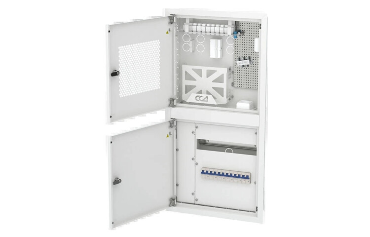 Предназначен для размещения электротехнического, пассивного и активного сетевого оборудования, в том числе с беспроводным доступом. Шкаф квартирный телекоммуникационный встраиваемый двухсекционный представляет собой двухсекционный корпус и внешний лючок, состоящий из накладной рамки с двумя дверцами из стали толщиной 1,0 мм. Верхняя и нижняя секция корпуса соединяются между собой с помощью проставки. Верхняя дверца имеет перфорацию для охлаждения установленного внутри активного оборудования и прохождения радиосигнала от WI-FI роутера. Нижняя дверца цельнометаллическая. Для предотвращения несанкционированного доступа внутрь шкафа, обе дверцы оборудованы замками. Двухсекционный корпус шкафа с четырёх сторон, а также на задней стенке имеет выламываемые кабельные вводы диаметром 36мм. В комплекте со шкафом поставляются 6 резиновых заглушек кабельного ввода. На каждой боковой стенке, а также на задней стенке корпуса выполнены отверстия диаметром 8,5мм для крепления шкафа в стене на дюбелях. На задней стенке внутри