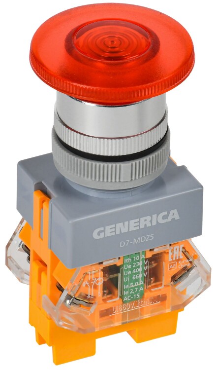 Кнопка управления D7-MDZS "Грибок" d=22мм 1NC+1NO с подсветкой и фиксацией красная GENERICA