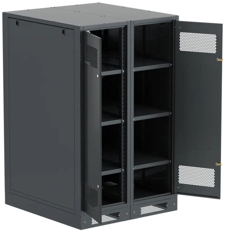 Шкаф аккумуляторный серии LINEA B предназначен для размещения и защиты от несанкционированного доступа аккумуляторных батарей (АБ). Шкафы LINEA B повышенной прочности со сварным каркасом и усиленными полками позволяют размещать АБ до 500 кг. на полке. Вместе со шкафом поставляются полки. Количество полок в комплекте зависит от высоты шкафа. Каркас позволяет размещать полки с шагом 30мм. В полках предусмотрены вырезы для удобства соединения АБ. В нижней части корпуса предусмотрена плата для установки предохранителя-выключателя-разъединителя ПВР. Шкаф аккумуляторный серии LINEA B двухсекционный поставляется на цоколе высотой 100мм. и состоит их двух секций. В месте эксплуатации требуется соединение секций метизами из комплекта поставки. Все металлические части шкафа LINEA B заземлены. В комплект включены РЫМ-болты для удобства перемещения шкафа. Вентиляционные отверстия в дверях и задней панели обеспечивают циркуляцию воздуха.