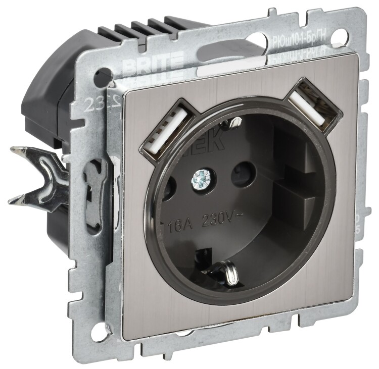BRITE Розетка 1-местная с заземлением с защитными шторками 16А с USB A+A 5В 2,1А РЮш10-1-БрГН металл