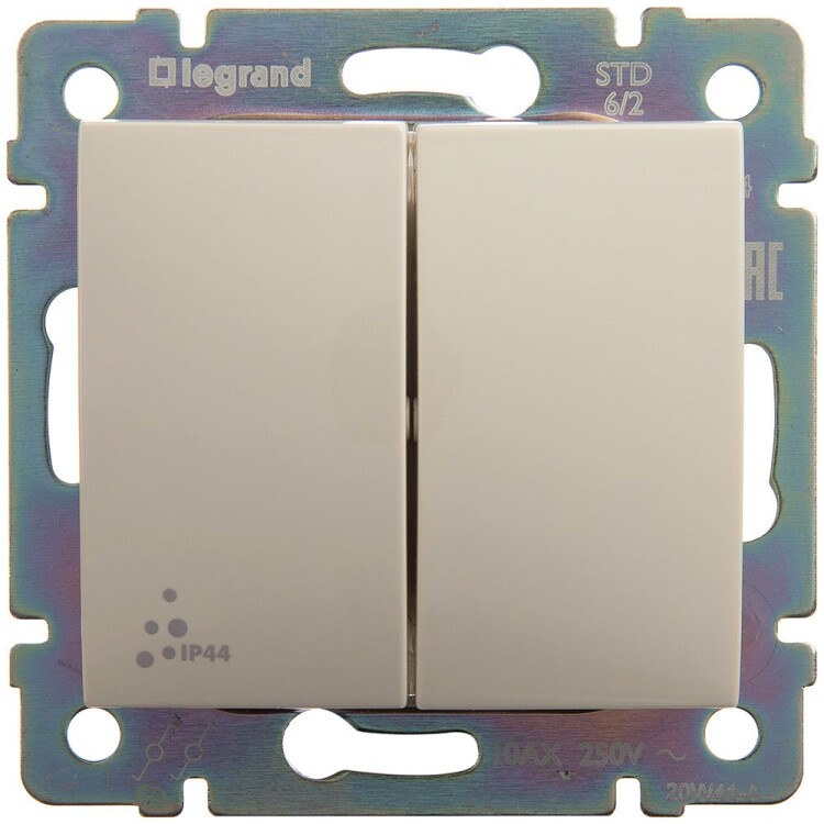 Переключатель двухклавишный IP44 VALENA - 10А 250В схема 6/2 безвинтовые зажимы. Предназначен для установки в электрических сетях жилых и общественных зданий и используется для управления приборами освещения, вентиляции и т.д. Используется для независимой коммутации двух нагрузок и управления нагрузкой с одного, двух или более мест (совместно с промежуточными выключателями). Обладает повышенной степенью пылевлагозащиты IP44 и подходит для установки в помещениях с повышенной влажностью.