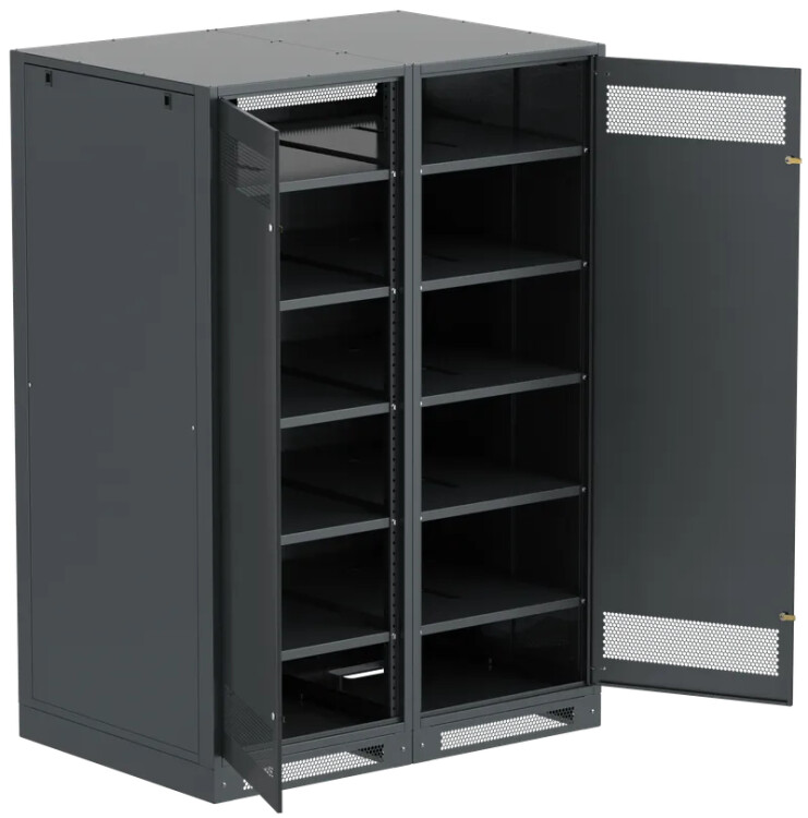 Шкаф аккумуляторный серии LINEA B предназначен для размещения и защиты от несанкционированного доступа аккумуляторных батарей (АБ). Шкафы LINEA B повышенной прочности со сварным каркасом и усиленными полками позволяют размещать АБ до 500 кг. на полке. Вместе со шкафом поставляются полки. Количество полок в комплекте зависит от высоты шкафа. Каркас позволяет размещать полки с шагом 30мм. В полках предусмотрены вырезы для удобства соединения АБ. В нижней части корпуса предусмотрена плата для установки предохранителя-выключателя-разъединителя ПВР. Шкаф аккумуляторный серии LINEA B двухсекционный поставляется на цоколе высотой 100мм. и состоит их двух секций. В месте эксплуатации требуется соединение секций метизами из комплекта поставки. Все металлические части шкафа LINEA B заземлены. В комплект включены РЫМ-болты для удобства перемещения шкафа. Вентиляционные отверстия в дверях и задней панели обеспечивают циркуляцию воздуха.