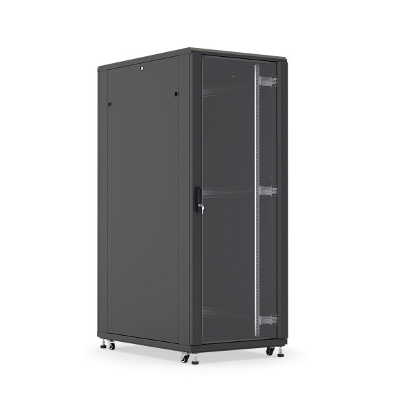 Напольный шкаф DANNMAN ТXQ-1868-GS-IP30-RAL9005 предназначен для монтажа 19-дюймового оборудования высотой 18U. Стальной корпус имеет габариты 988×600×800 мм и рассчитан на нагрузку до 900 кг. Передняя стеклянная дверь обеспечивает визуальный контроль, а задняя металлическая дверь поддерживает прочность и защищённость конструкции.