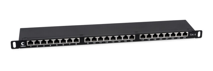 Коммутационные панели (патч-панели) предназначены для терминирования на них кабелей различных подсистем СКС и для коммутации отдельных элементов сети друг с другом при помощи коммутационных шнуров. Экранированная патч-панель Cabeus выполнена в 19” формате и предназначена для установки в телекоммуникационные шкафы и стойки. Соответствует характеристикам категории 6. Высота 0,5U. Имеет 24 порта RJ-45. С лицевой стороны все порты. Корпус полностью металлический с разборной крышкой быстрой фиксации. Имеется проводник заземления. С тыльной стороны патч-панели размещены контакты типа Dual IDC с цветной маркировкой по двум стандартам: T568 А и B. Ножи контактов располагаются под 45°, что лучше сказывается на передаточных характеристиках разъема. Для заделки проводников подходят ножи тип 110 и Krone. Патч-панель имеет встроенный задний организатор для фиксации кабелей и дополнительный фиксатор экрана кабеля.